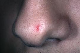 Spider angioma on tip of nose of a female patient before and after second treatment using Photoderm. Angioma has completely cleared.